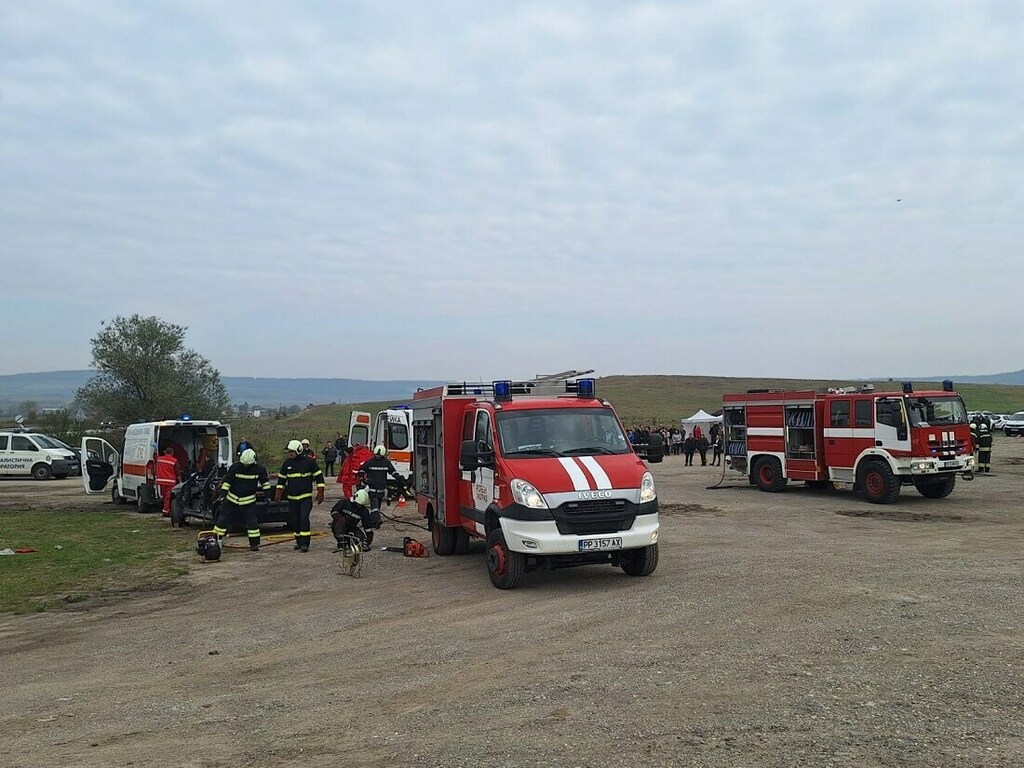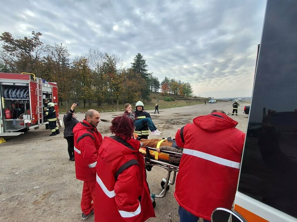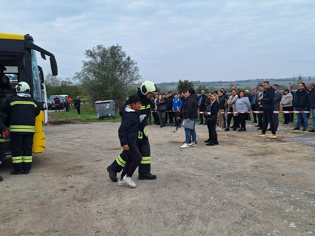 При симулацията беше пресъздаден възникнал вследствие на лоши метеорологични условия тежък пътен инцидент – сблъсък между товарен автомобил, превозващ лесно запалима течност, училищен автобус
